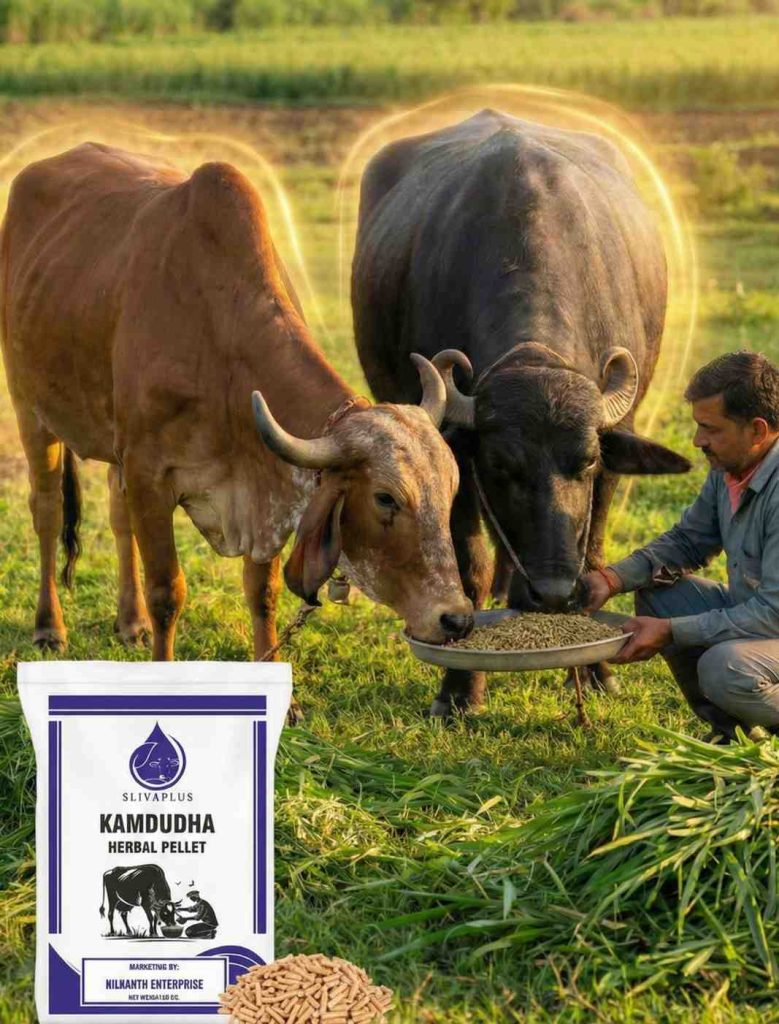 Kamdudha Herbal Pellet by Slivaplus is a premium herbal pellet feed supplement specially formulated to improve milk production, strengthen digestion, and keep cattle healthy and active.